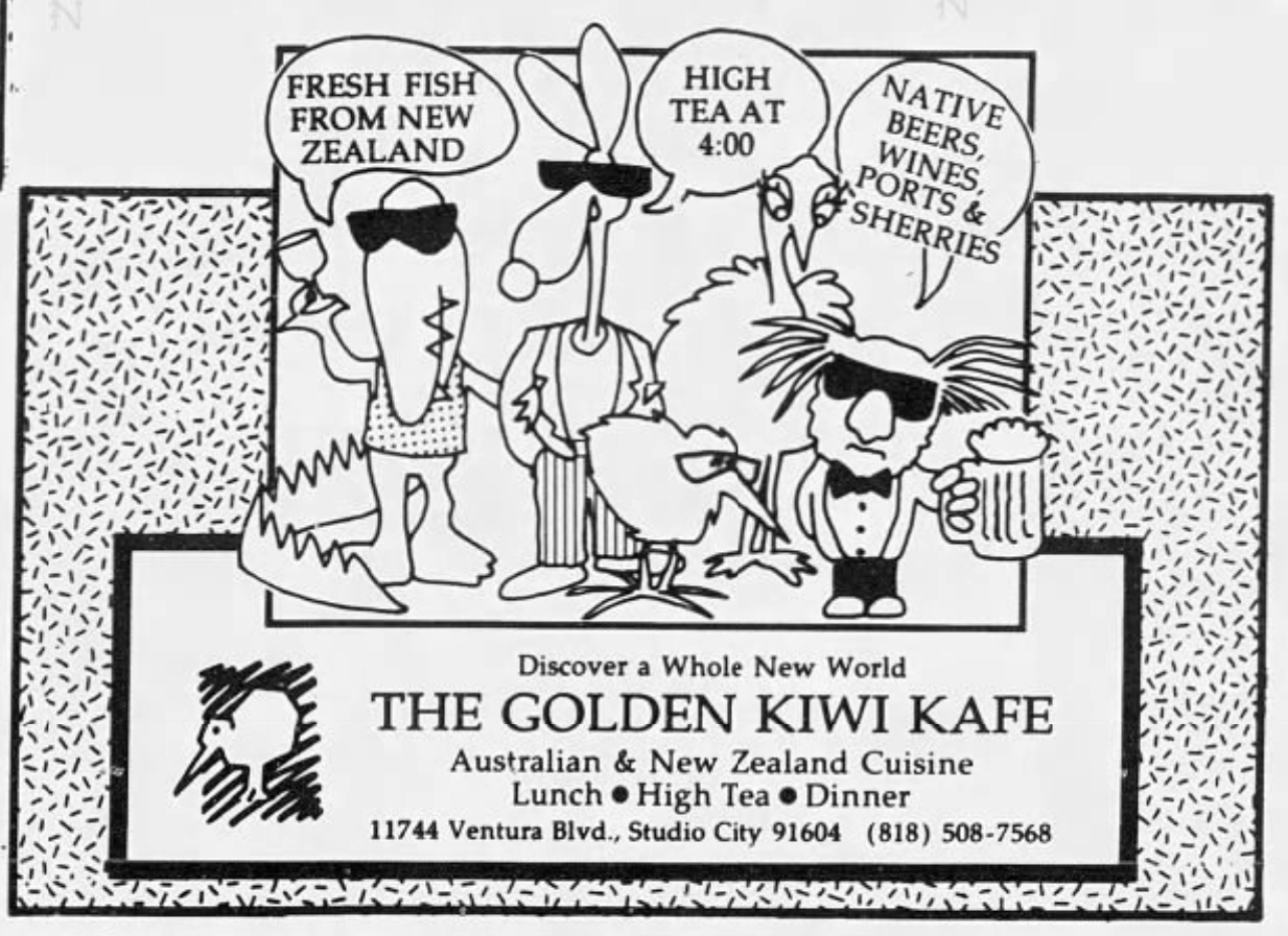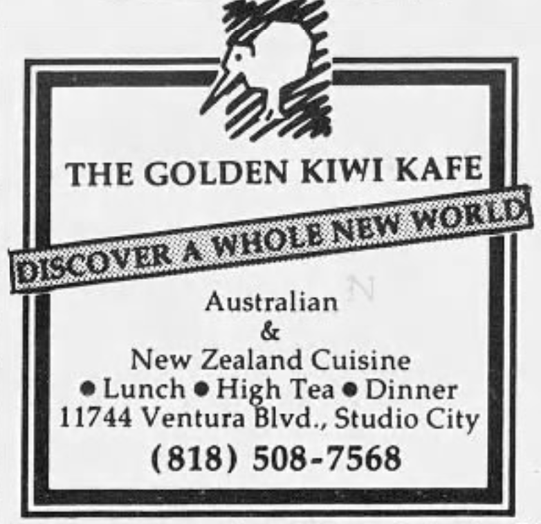 The first New Zealand restaurant in Los Angeles may have been The Golden Kiwi Kafe, which was reviewed as a new establishment by Michelle Huneven for The Los Angeles Times in 1988. Lucifer’s Pizza is a well-known Los Angeles pizza chain founded by Aukland-raised Adam Borich. The first location opened in Los Feliz in 2008. Two Guns Espresso was founded in 2011 in Manhattan Beach by New Zealanders Andrew and Natalie Stanisich. Gwithyen “Gwith” Thomas and his wife, Justine, opened Aroha New Zealand Cuisine in Westlake Village in 2014. It closed in 2018 due to the Woolsey Fire. Tangaroa Fish Market, in Culver City’s Culver-West neighborhood, was established by Pukerua Bay-raised Mark White in 2015. Ponsonby Road Cafe, named after one of Auckland’s most famous strips, is owned by New Zealander immigrant, Jonathan Glover, who opened it in Beverly Grove in 2020. Matū and Matū Kai are two upscale steakhouses in Los Angeles built entirely around a partnership with First Light Farms in New Zealand. They were founded by Jerry A. Greenberg (a co-founder of Sugarfish) and others. They opened in Roxbury Park in 2020 and Brentwood in 2025, respectively. Duncan Parsons and Joe Wedd, both from Hawke’s Bay, launched Creamy Boys Ice Cream out of a truck in 2020. In 2023, they opened their first shop in Hermosa Beach. A second location, in El Segundo, followed. Three brothers – Anand, Bud, and Dhyan Chalmers – founded Hokey Pokey LA in 2022. After opening their first location in Century City, the Hawke’s Bay natives expanded into Culver City’s Fox Hills (since closed) and the Ovation in Hollywood-Highland. Although further away, Kairoa Brewing Company, in San Diego’s University Heights, is run by immigrants from Akaroa and Kaikoura. The Gum Tree Shop & Cafe is Australian but serves items popular with kiwis like meat pies.