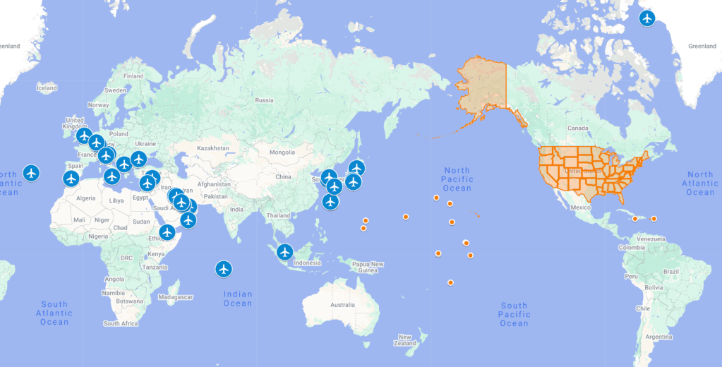 As someone who categorically opposes repression, imperialism, torture, environmental devastation, forced labor, and forced re-education — and who values democracy and civil liberties — you will not often find me championing the regimes of either China nor the US — nor the governments of many other countries, for that matter. I do, though, prefer soft power to hard power. The disparity in global presence is what led me to reflect on the literature of empire and influence — topics which were on my mind after reading Daniel Immerwahr‘s How to Hide an Empire: A History of the Greater United States and Jung Chang‘s Big Sister, Little Sister, Red Sister: Three Women at the Heart of Twentieth-Century China. So I made a map of both Greater America and China and Chinatowns. Americans don’t really do American enclaves. You won’t find “Americatowns” when traveling. What you will find, however, are American military bases which, for better or for worse, are our country’s closest equivalent. You won’t find all of them, though, because whilst Chinatowns are promoted, the locations and existence of many American military bases are classified.